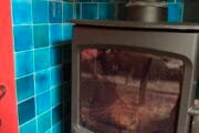 - ‘Rustic corners’ cut hand glazed tiles with small coloured blue glazed insets. 4″ 10cm tiles.